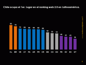 Chile, Brasil y Venezuela lideran el Ranking Web 2.0 en América Latina. Este ranking fue calculado mediante una metodología que nos permite ubicar a los países de Latinoamérica en una escala de acuerdo al mayor o menor uso que hagan de la web 2.0 tomando en cuenta cuatro dimensiones: Adopción de los usuarios a la web 2.0, Creación de contenidos, Compartir este contenido e Influenciar, que está definida por la capacidad de los usuarios de generar impacto a través de la creación de grupos con intereses afines, organización de causas o eventos y generación de comentarios.